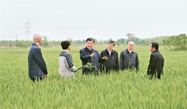 2023年5月11日至12日,中共中央總書記、國家主席、中央軍委主席習近平在河北考察,并主持召開深入推進京津冀協同發展座談會。這是11日上午,習近平在滄州市黃驊市舊城鎮仙莊片區旱堿地麥田考察時,同種植戶、農技專家親切交流。 新華社記者 李學仁/攝