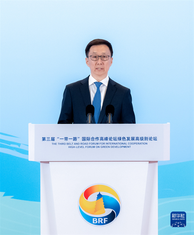 國家副主席韓正10月18日下午出席第三屆“一帶一路”國際合作高峰論壇綠色發展高級別論壇并致辭。