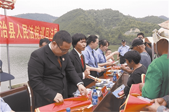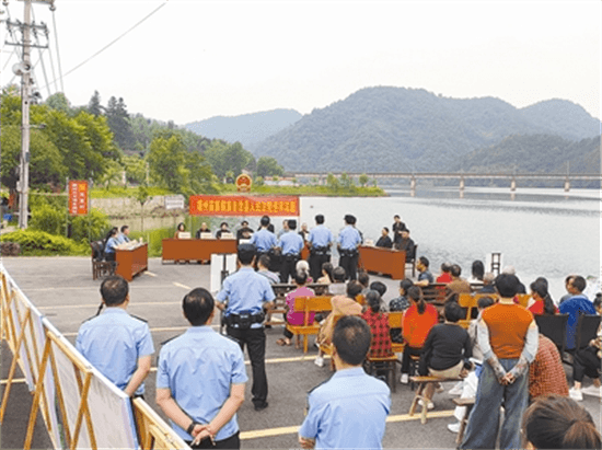 近日,湖南省靖州苗族侗族自治縣人民法院將巡回法庭搬到了渠水之畔的五龍?zhí)秶覞竦毓珗@,在該縣渠陽鎮(zhèn)泡里村公開開庭審理了一起非法捕撈水產(chǎn)品刑事附帶民事公益訴訟案件。部分縣人大代表、縣政協(xié)委員,縣森林公安局、市生態(tài)環(huán)境局靖州分局、縣農(nóng)業(yè)農(nóng)村局等各單位代表及周邊群眾50余人旁聽了本次庭審。