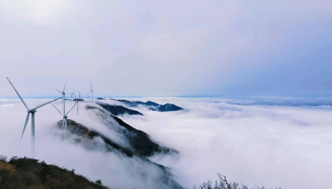 站在三省坡下遠眺,數十臺大型風電站聳入云端,山巒、風機、流云,構成了一幅美麗畫卷。