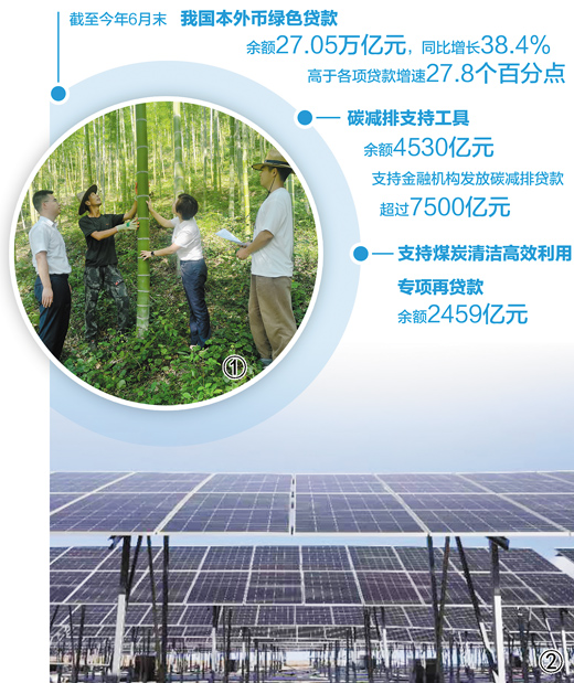 目前,我國已經形成以綠色貸款和綠色債券為主、多種綠色金融工具蓬勃發展的多層次綠色金融市場體系。數據顯示,截至今年6月末,我國本外幣綠色貸款余額27.05萬億元,同比增長38.4%,高于各項貸款增速27.8個百分點,比年初增加5.45萬億元;兩項貨幣政策工具余額分別達4530億元和2459億元,比上年末增加1433億元和1648億元,其中,碳減排支持工具支持金融機構發放碳減排貸款超過7500億元,帶動年度碳減排量超過1.5億噸二氧化碳當量。