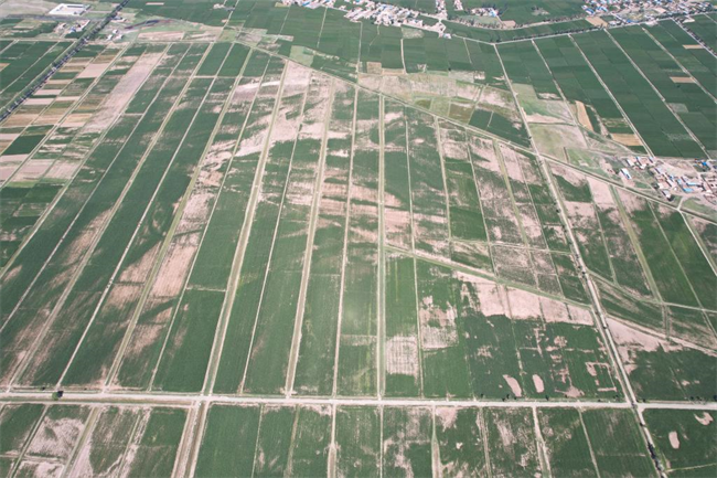 平羅縣一處鹽堿地典型區域,白色裸露部分為農作物難以生長的重度鹽堿地(2023年7月攝)。(平羅縣農業農村局供圖)