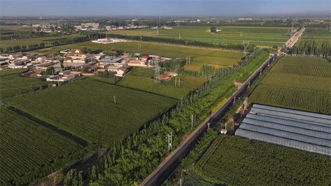 東興村周邊建起防護林網(無人機照片,2023年9月12日攝)。新華社記者李云平 攝