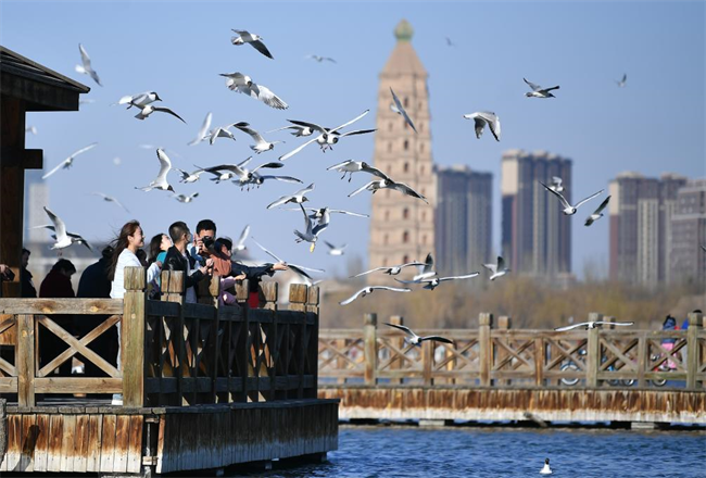 市民在寧夏銀川市海寶公園觀賞候鳥(2023年3月12日攝)。新華社記者王鵬 攝