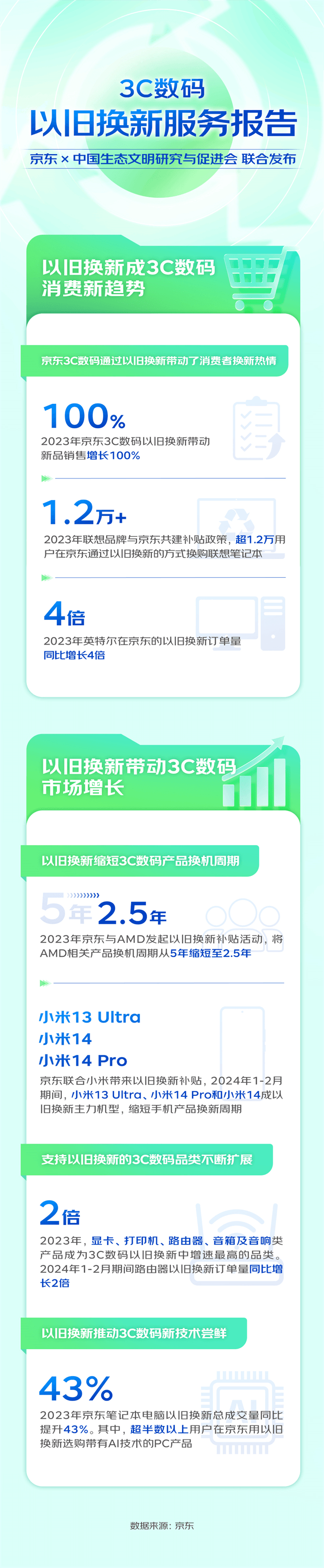 為積極響應2024年3月1日國務院常務會審議通過的《推動大規模設備更新和消費品以舊換新行動方案》和《2024年國務院政府工作報告》中要“穩定和擴大傳統消費,鼓勵和推動消費品以舊換新,提振智能網聯新能源汽車、電子產品等大宗消費”的重大決策,發揮以舊換新對生態環境保護產生的作用,中國生態文明研究與促進會聯合京東,于2024年3月14日發布《3C數碼以舊換新服務報告》。
