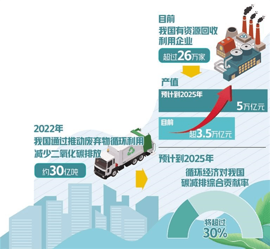 回收循環利用還可通過再生利用、二手商品交易、再制造等不同層級的利用方式實現多維度降碳。中國循環經濟協會會長朱黎陽表示,再生利用可有效減少原材料開采、運輸及生產加工過程中的碳排放;二手商品交易、再制造等可延長產品使用壽命。據測算,2022年,我國通過推動廢棄物循環利用,減少二氧化碳排放約30億噸。預計到2025年,循環經濟對我國碳減排的綜合貢獻率將超過30%。