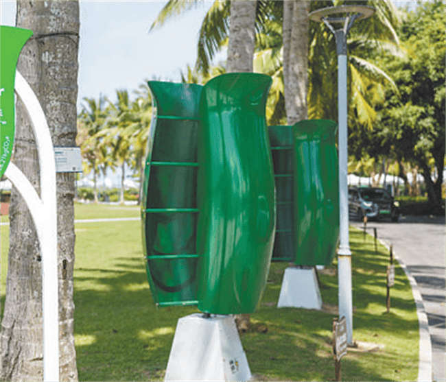 在博鰲亞洲論壇國際會議中心噴泉廣場,兩排綠色“花朵風機”迎風綻放。“它是目前世界上啟動速度最低的風機,1.2米每秒的風速即可啟動,能實現24小時持續發電。”劉聯偉說,在博鰲,風、光、熱等資源是近零碳示范區創建的最大優勢。
