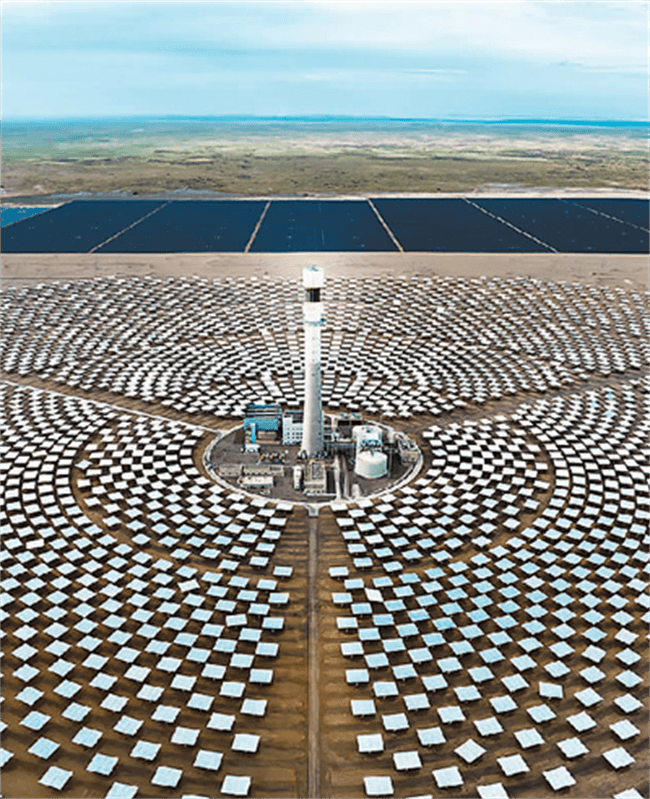 青海格爾木光伏園熔鹽塔式光熱電站,如同盛開在戈壁上的巨大“向日葵”。駱先洋攝(人民圖片)