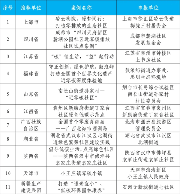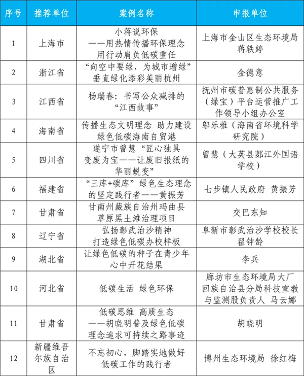 為進一步提升全社會綠色低碳意識,生態環境部在2023年“全國低碳日”主場活動中啟動了系列典型案例征集活動。活動共收到31個省(區、市)、新疆生產建設兵團推薦的園區、企業、社區、個人、綠色低碳公眾參與實踐基地等5個類別的311個綠色低碳典型案例,集中展現了各行業、各領域積極探索綠色低碳發展和生態環境保護協同路徑的生動實踐。經過各地組織推薦、專家審議、公示等環節,產生2023年綠色低碳典型案例獲選名單。