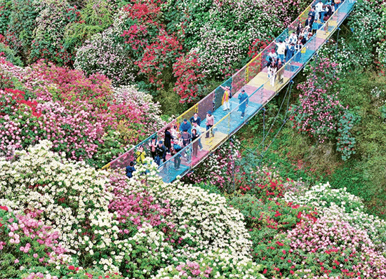 發展綠色生產力,堅持綠水青山就是金山銀山理念,推動經濟社會發展全面綠色轉型,是滿足人民日益增長的優美生態環境需要的必然要求。圖為2024年4月4日,游客在貴州省畢節市百里杜鵑景區踏青賞花(無人機照片)。 新華社發 李華/攝