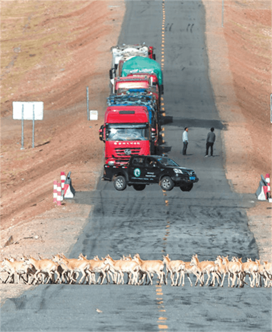 為保證藏羚羊繁衍遷徙順利進行,青藏鐵路設置33處遷徙通道,青藏公路為藏羚羊遷徙采取臨時交通管制措施,青藏線沿線各保護站協助藏羚羊繁衍遷徙……在青藏線上,順利遷徙的藏羚羊群,展現著人與自然和諧共生的生動畫面。