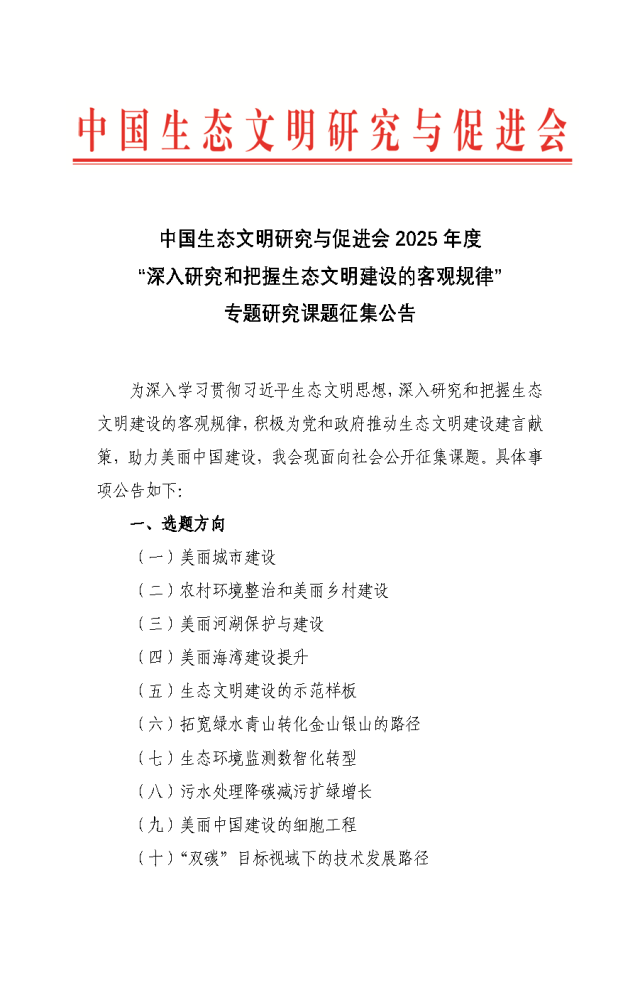 中國生態文明研究與促進會2025年度“深入研究和把握生態文明建設的客觀規律”專題研究課題征集公告