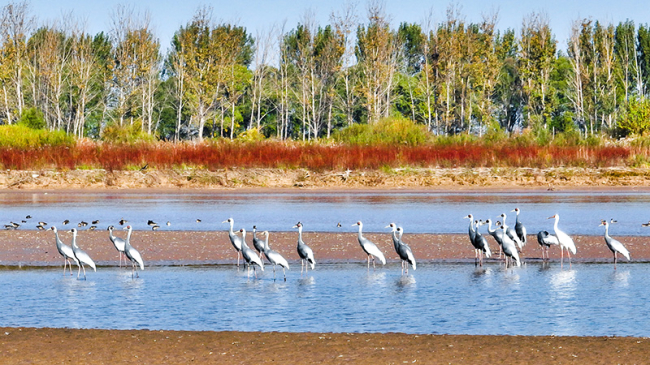 在山東黃河三角洲國家級自然保護區拍攝的白枕鶴(2022年10月18日攝)。