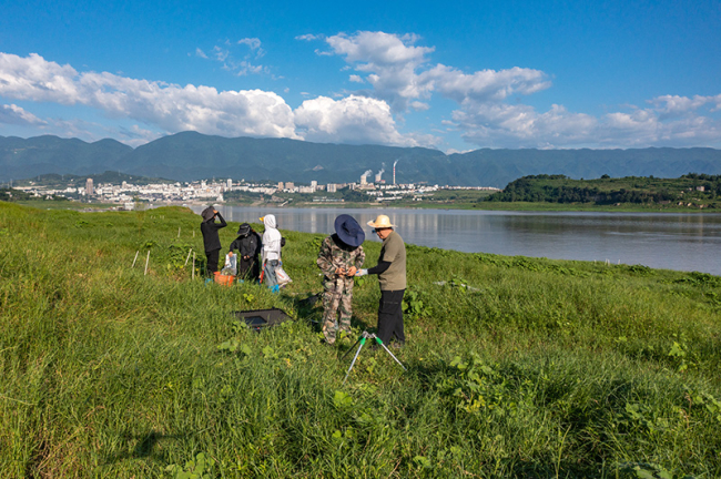 在位于重慶的中國科學院三峽庫區水土保持與環境研究站,中國科學院成都山地所科研人員在庫區消落帶上開展相關監測(2023年7月5日攝,無人機照片)。