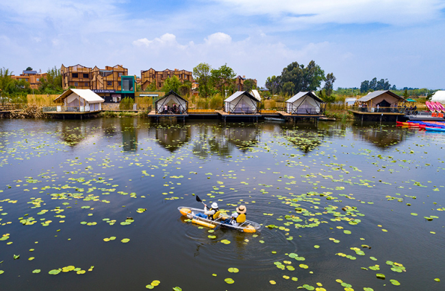 游人在滇池南岸晉寧區上蒜鎮小漁村劃船休閑(2023年4月30日攝,無人機照片)。