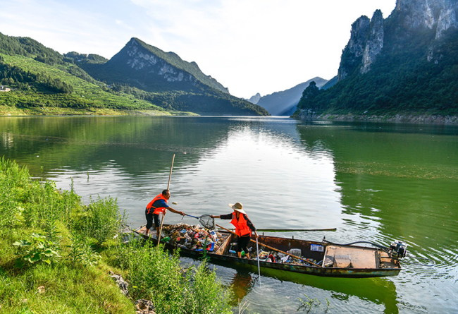 貴州省甕安縣珠藏鎮豐巖村村民盧錫永、冉茂英夫婦駕駛小船在烏江上打撈漂浮物(2023年7月10日攝)。