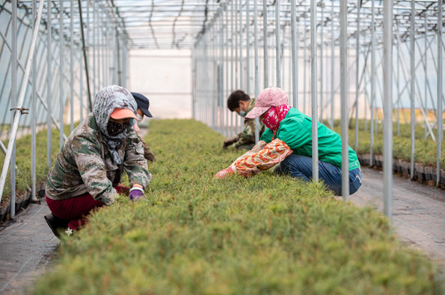 在黑龍江伊春森工集團紅松種苗繁育基地,工作人員在養護輕基質紅松苗(2023年5月20日攝)。