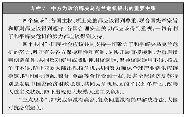 面對此起彼伏的熱點問題,中國始終致力于發揮負責任大國作用,推動朝鮮半島、巴勒斯坦、伊朗核、敘利亞、阿富汗等國際地區問題解決。在烏克蘭問題上,中方積極勸和促談,先后提出“四個應該”“四個共同”“三點思考”的主張,發布《關于政治解決烏克蘭危機的中國立場》文件。派出中國政府歐亞事務特別代表,就政治解決烏克蘭危機同有關各方廣泛接觸和交流。在中國斡旋下,沙特和伊朗實現歷史性和解,為地區國家通過對話協商化解矛盾分歧、實現睦鄰友好樹立了典范,有力引領了中東地區“和解潮”。