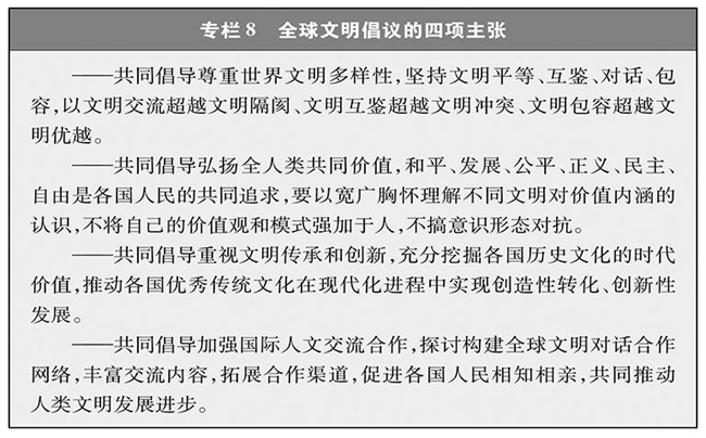 ——中國提出全球文明倡議,共同倡導尊重世界文明多樣性,共同倡導弘揚全人類共同價值,共同倡導重視文明傳承和創新,共同倡導加強國際人文交流合作。全球文明倡議向全世界發出增進文明交流對話、在包容互鑒中促進人類文明進步的真摯呼吁,為推動構建人類命運共同體注入了精神動力。