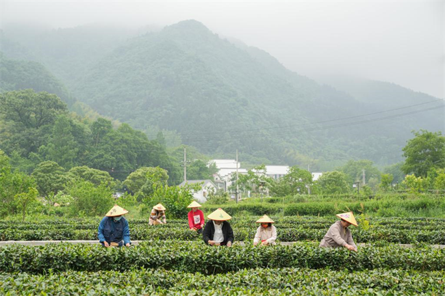 2022年5月11日,村民在大灣村生態茶園內采摘茶葉。新華社記者杜宇攝