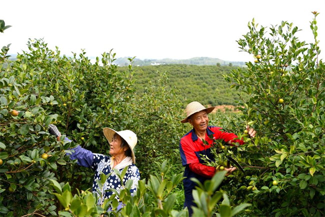 2020年8月25日,村民在河南省光山縣槐店鄉司馬光油茶園內勞作。新華社記者郝源攝