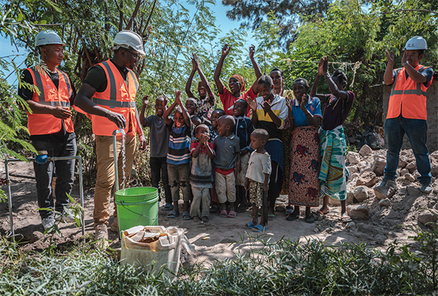 6月13日,在坦桑尼亞姆萬扎省米松圭,凱爾文(左二)與同事接通水管后贏得當地居民鼓掌歡呼。新華社記者 王冠森 攝