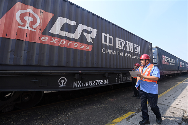 9月18日,在天津港物捷三堆場,工作人員在檢查發運前的一列中歐(中亞)班列。新華社記者 趙子碩 攝