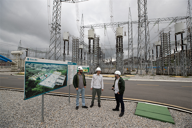 2022年9月30日,在巴西里約熱內盧美麗山特高壓輸電二期項目里約換流站,國網巴控公司換流站運維主管(中)和巴方人員交談。新華社記者 王天聰 攝