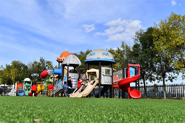 在山東省東營市墾利區楊廟社區幼兒園,孩子們在老師的帶領下進行戶外活動(2021年10月19日攝)。新華社記者 郭緒雷 攝