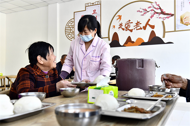 在山東省東營市墾利區楊廟社區養老服務中心,工作人員為老人盛午餐(2021年10月18日攝)。新華社記者 郭緒雷 攝