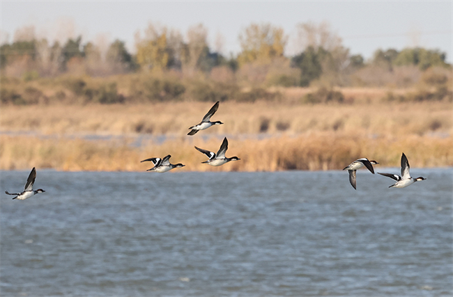 2023年11月12日,在黃河三角洲國家級自然保護區,越冬候鳥在飛翔。新華社記者 徐速繪 攝