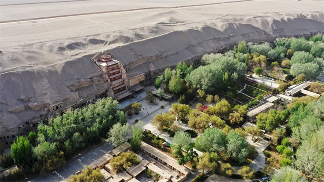 這是2023年4月25日拍攝的甘肅敦煌莫高窟窟區(qū)(無人機照片)。新華社記者 陳斌 攝