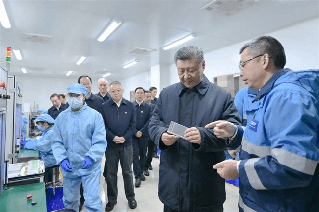 3月18日至21日,中共中央總書記、國家主席、中央軍委主席習近平在湖南考察。這是18日下午,習近平在中德合資企業巴斯夫杉杉電池材料有限公司考察。新華社記者 謝環馳 攝