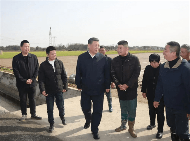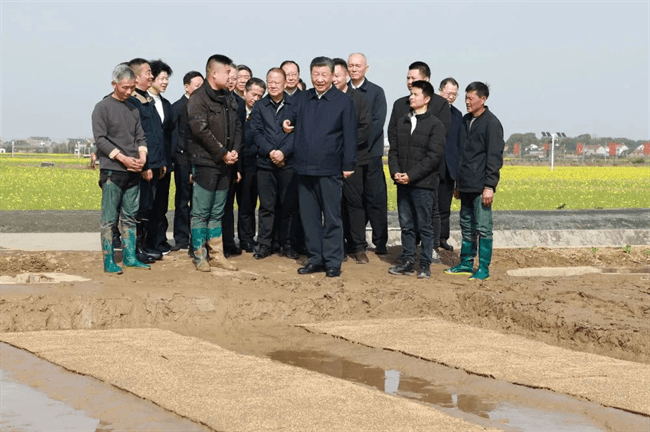 3月18日至21日,中共中央總書記、國家主席、中央軍委主席習近平在湖南考察。這是19日下午,習近平在常德市鼎城區謝家鋪鎮港中坪村,同種糧大戶、農技人員、基層干部親切交流。新華社記者 鞠鵬 攝