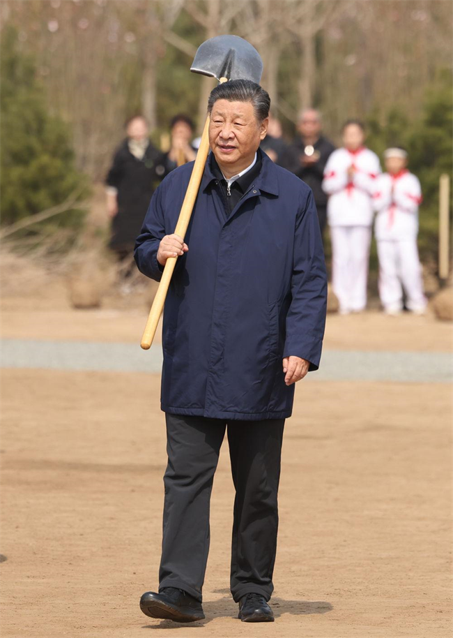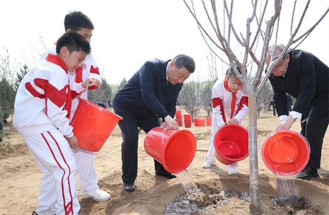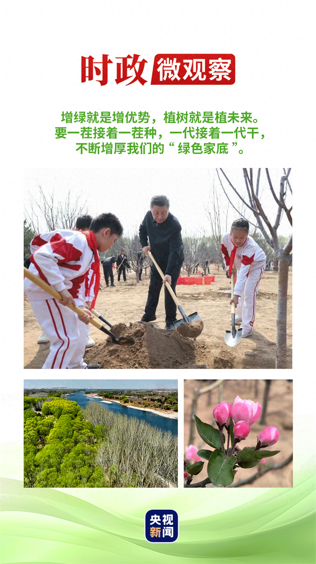 一次次揮鍬鏟土、培土圍堰、提水澆灌,總書記身體力行、率先垂范,就是要號召大家都行動起來,積極參與植樹造林,人人爭當綠色使者、生態先鋒,為建設美麗中國增綠添彩,共同譜寫人與自然和諧共生的中國式現代化新篇章。