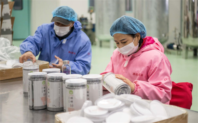 △2024年3月12日,黑龍江伊春一家公司內,工作人員在包裝樺樹汁相關產品。