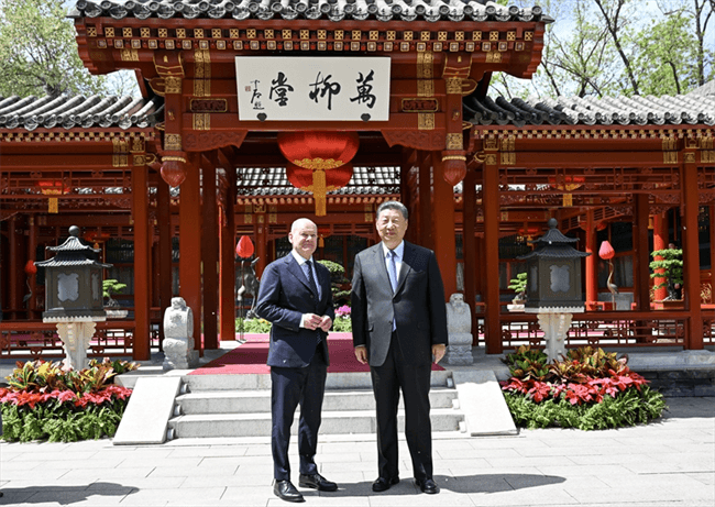 4月16日上午,國家主席習近平在北京釣魚臺國賓館會見德國總理朔爾茨。這是習近平同朔爾茨合影。新華社記者 謝環馳 攝