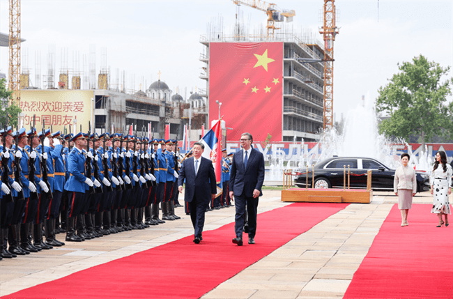 5月的貝爾格萊德,陽光明媚。塞爾維亞大廈前,中塞兩國國旗迎風飄揚,儀仗隊威武雄壯。習近平和夫人彭麗媛乘車抵達時,塞爾維亞總統武契奇和夫人塔瑪拉在下車處熱情迎接。