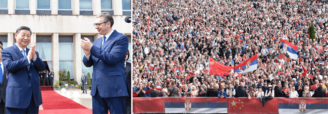 當地時間5月8日上午,國家主席習近平在貝爾格萊德塞爾維亞大廈同塞爾維亞總統武契奇舉行會談。會談前,武契奇陪同習近平來到政府大廈平臺(左圖)。大廈廣場上,一萬五千名塞爾維亞民眾揮舞中塞兩國國旗,對習近平表示最熱烈的歡迎(右圖)。(拼版照片)新華社記者 黃敬文 丁海濤 攝