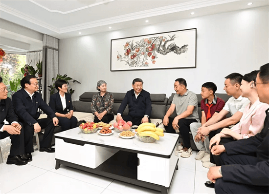 習近平來到社區居民趙守成家中,同一家人圍坐在一起拉家常,了解他們的就業、收入、醫保報銷、孩子上學等情況,為他們的幸福生活點贊,鼓勵孩子德智體美勞全面發展。趙守成告訴總書記,當地黨委和政府十分關心社區建設,特別是在改造老舊小區、豐富居民文體生活等方面做了很多實事,各族群眾在社區里和睦相處,生活過得很舒心。習近平強調,我們黨是全心全意為人民服務的黨,各族群眾、家家戶戶都是我的牽掛。希望你們把家庭建設搞得更好,讓日子越過越紅火。