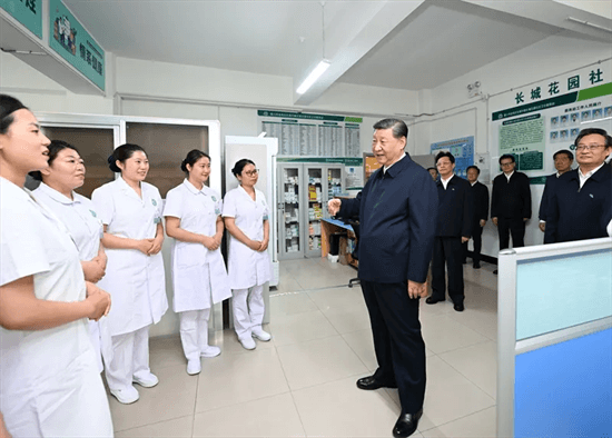 6月19日至20日,中共中央總書記、國家主席、中央軍委主席習近平在寧夏考察。這是19日下午,習近平在銀川市金鳳區長城花園社區黨群服務中心社區衛生站同醫務人員親切交流。新華社記者 謝環馳 攝