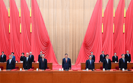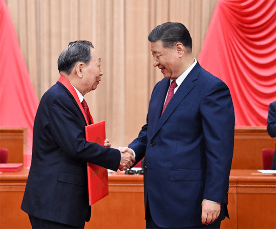 李強主持大會,丁薛祥宣讀獎勵決定,趙樂際、王滬寧、蔡奇、李希出席。