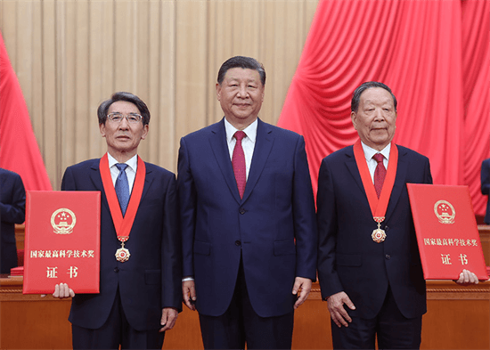 6月24日,全國科技大會、國家科學技術獎勵大會和中國科學院第二十一次院士大會、中國工程院第十七次院士大會在北京人民大會堂隆重召開。中共中央總書記、國家主席、中央軍委主席習近平向獲得2023年度國家最高科學技術獎的武漢大學李德仁院士(右)和清華大學薛其坤院士(左)頒獎。新華社記者 鞠鵬 攝