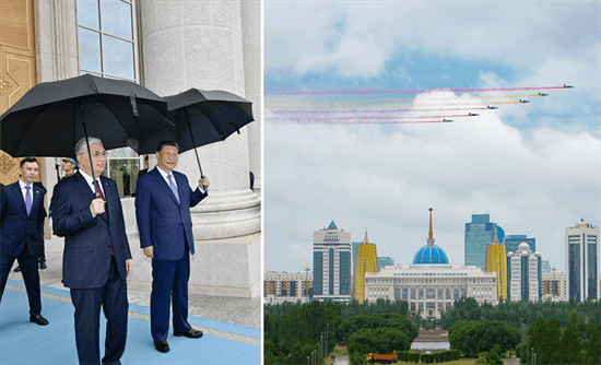 習近平乘車抵達總統(tǒng)府時,托卡耶夫總統(tǒng)熱情迎接。六架哈薩克斯坦空軍戰(zhàn)機從總統(tǒng)府上空飛過,拉出象征中國國旗的紅黃色彩煙,以最高禮儀歡迎習近平對哈薩克斯坦進行國事訪問。