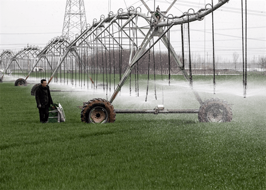 2024年3月18日,在河南省焦作市博愛縣孝敬鎮東原莊村瑞輝家庭農場,村民使用全自動指針式噴灌機進行澆灌作業。新華社發(程全?攝)