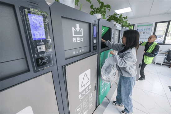 2024年4月10日,在浙江省湖州市吳興區飛英街道新華府小區內,居民在垃圾分類智能系統的指導下進行垃圾分類投放,居民的投放情況將實時匯總到智慧服務平臺,會有相應的積分獎勵。新華社記者 徐昱 攝