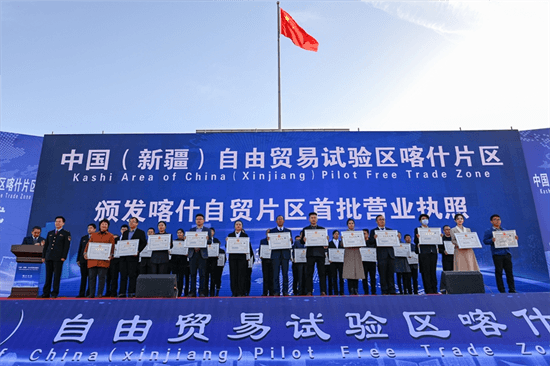 2023年11月11日,在中國(新疆)自由貿易試驗區喀什片區揭牌儀式現場,首批入駐自貿片區的經營主體獲頒營業執照。新華社記者 丁磊 攝