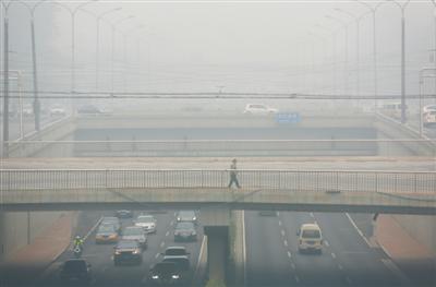 昨日,白石橋,一位市民走在霧霾中。當(dāng)日,北京空氣質(zhì)量達到嚴(yán)重污染。