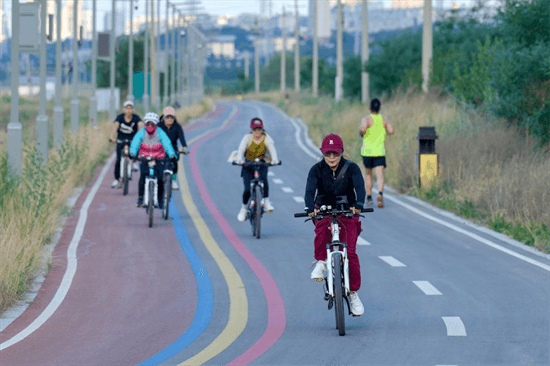 2024年6月5日,人們?cè)谶\(yùn)城鹽湖環(huán)湖步道上騎行。