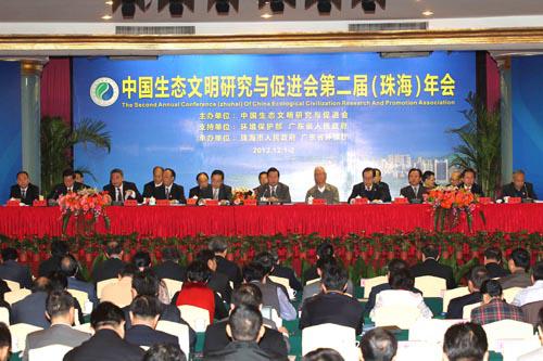 中國生態文明研究與促進會第二屆(珠海)年會12月1日在廣東省珠海市召開。中國生態文明研究與促進會總顧問、中共中央原政治局委員、國務院原副總理、九屆全國人大常委會副委員長姜春云為會議發來致辭。中國生態文明研究與促進會會長、十一屆全國政協副主席、農工黨中央常務副主席陳宗興出席會議并作總結講話。中國生態文明研究與促進會顧問、環境保護部部長周生賢出席會議并作主旨演講。